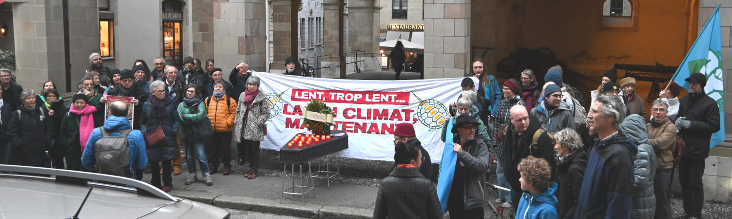 Parce que Genève n’est pas aujourd’hui sur la bonne voie dans la réduction des gaz à effet de serre, alors que les effets du réchauffement climatique se font de plus en plus menaçants, la Coalition climat appelle à un rassemblement pour faire pression sur le parlement afin qu’il se ressaisisse et assume sa responsabilité de doter enfin le canton d’une loi climat pour protéger la population. Nous nous rassemblerons devant le Grand Conseil tant que la loi climat ne sera pas votée.